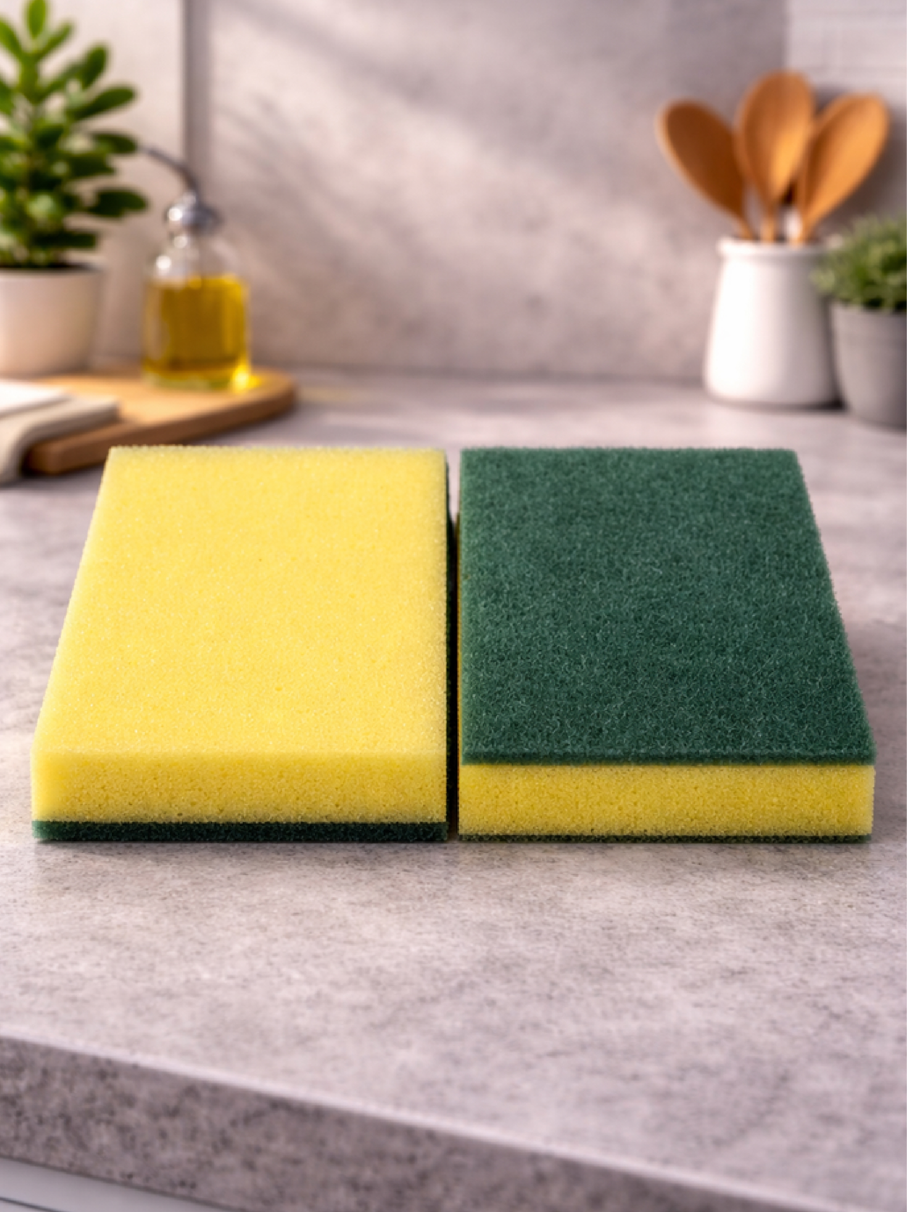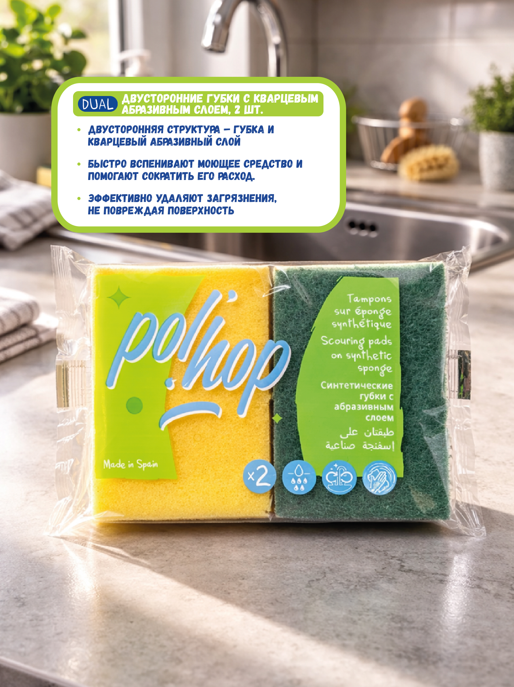 - Два рабочих слоя для разных задач – абразивная сторона на основе кварца удаляет стойкий жир и загрязнения, а мягкая губка удобна для основной мойки.