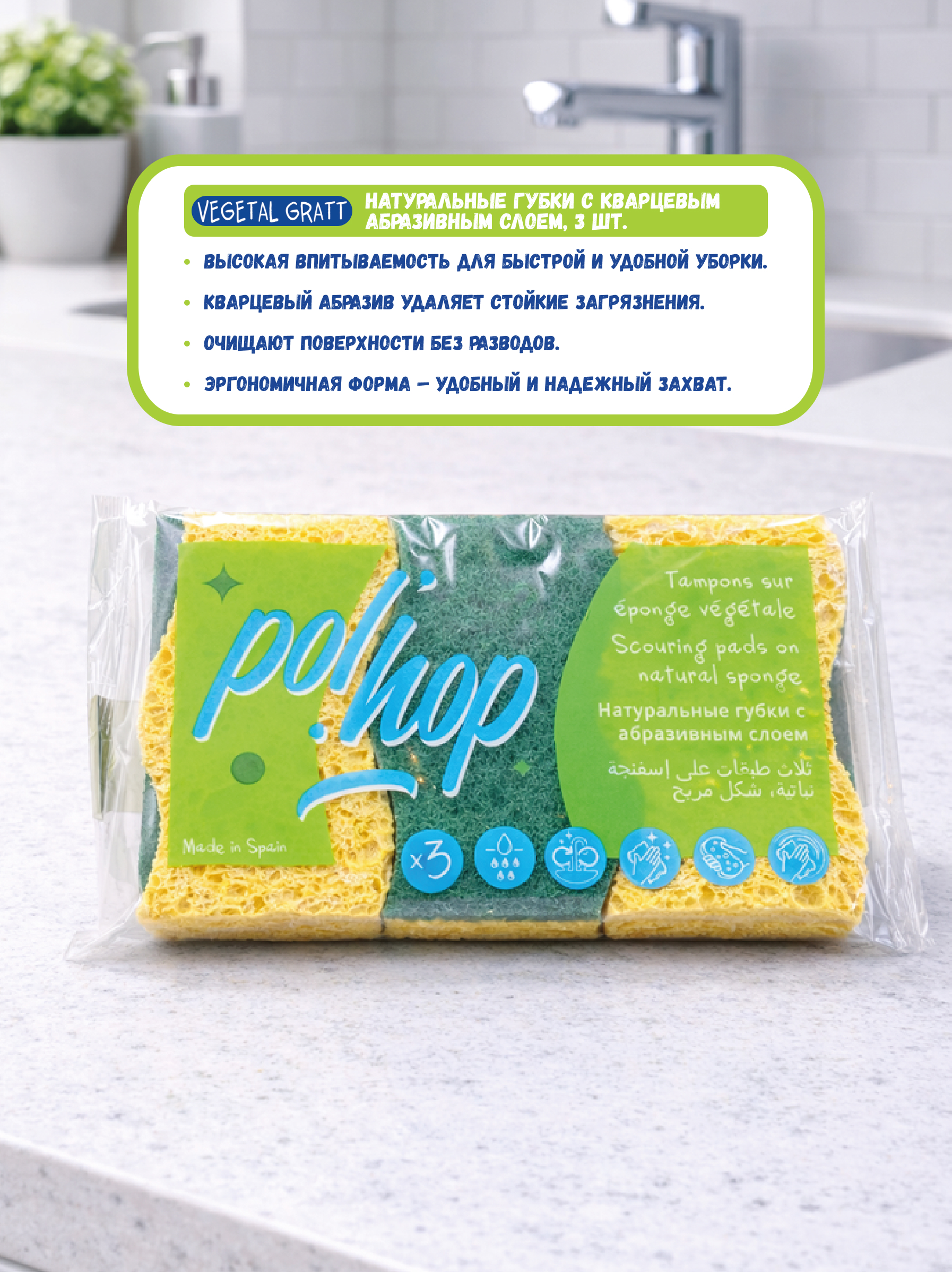 Губки VEGETAL GRATT эргономичной формы изготовлены из натуральной целлюлозы и имеют абразивный чистящий слоей для эффективного удаления загрязнений. Подходят для ежедневной уборки на кухне и в доме. Обеспечивают хорошую впитываемость и позволяют очищать посуду, стекло, столешницы и другие поверхности без царапин.