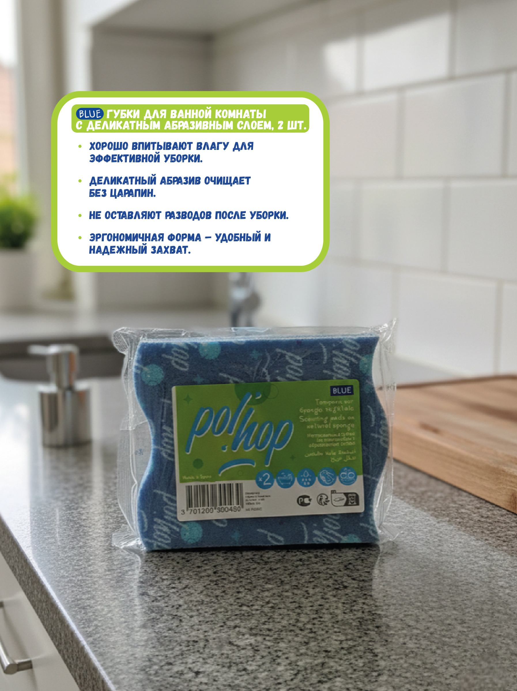 - Две рабочие стороны – абразивная сторона эффективно удаляет налет и загрязнения, мягкая сторона впитывает влагу и обеспечивает аккуратную очистку без разводов.
