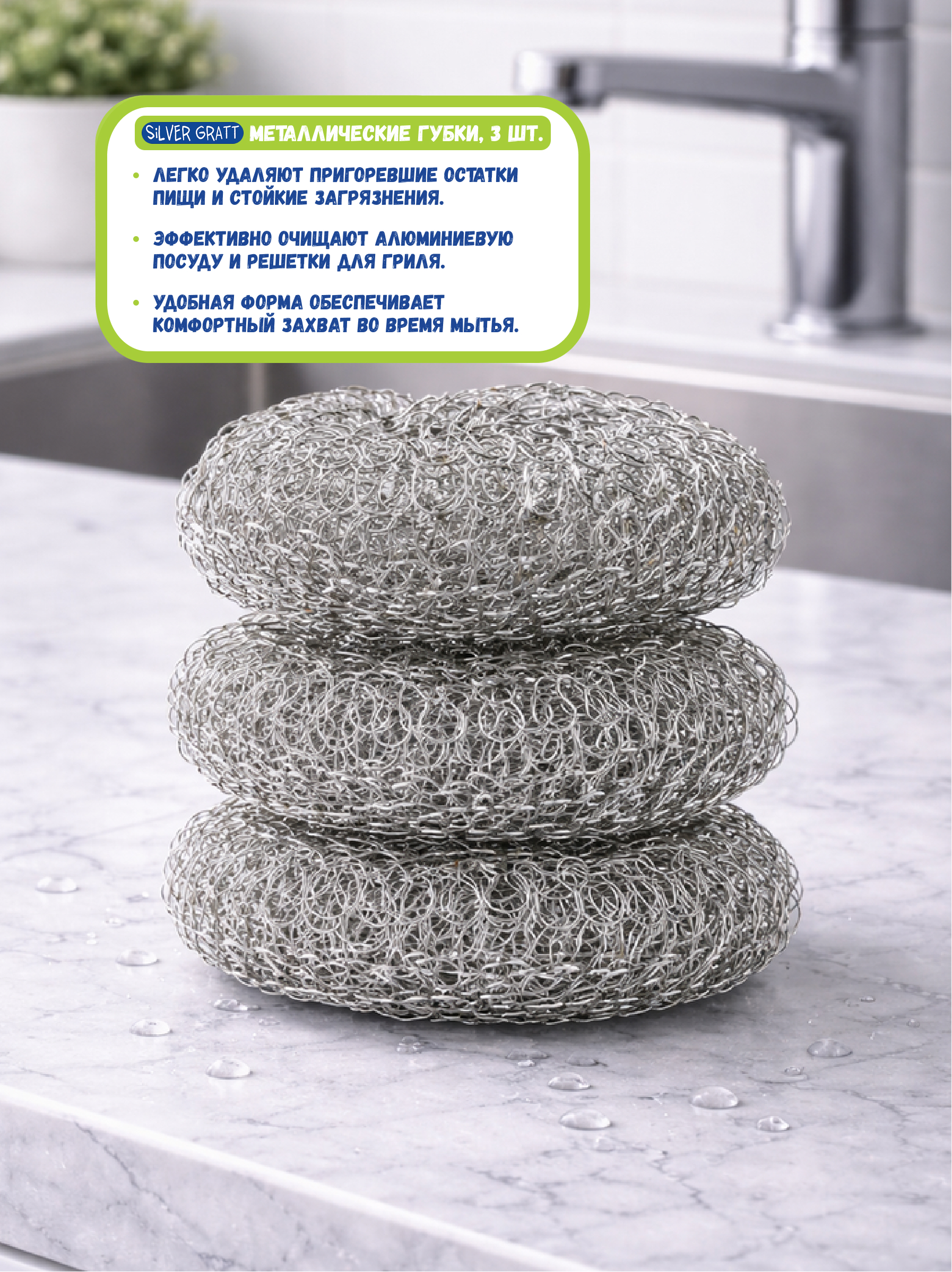 Металлические губки SILVER GRATT предназначены для интенсивной очистки посуды и кухонных поверхностей. Подходят для сковород, кастрюль, противней, решеток и других изделий, где требуется удаление нагара и стойких загрязнений. Помогают быстро удалить пригоревшие остатки пищи и жир.