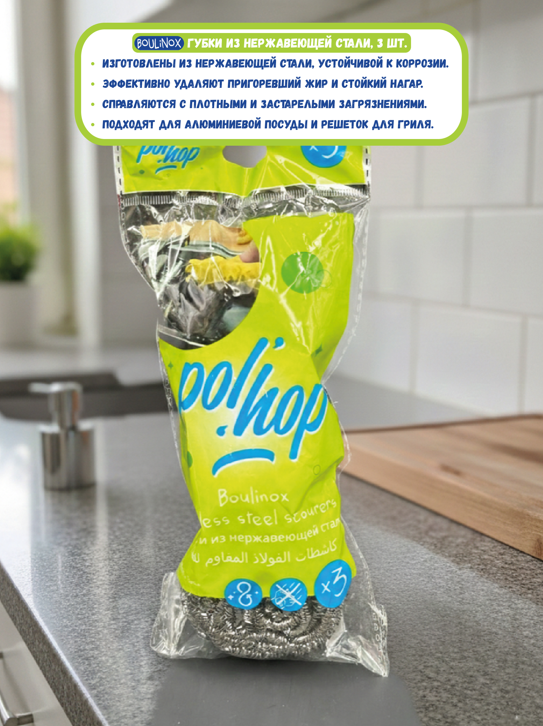 Металлические губки BOULINOX из нержавеющей стали предназначены для интенсивной очистки посуды и кухонных поверхностей. Подходят для кастрюль из нержавеющей стали, чугунных сковород, эмалированной посуды и решеток гриля, где требуется удаление нагара и стойких загрязнений. Помогают быстро очистить посуду от пригоревших остатков пищи и жира.