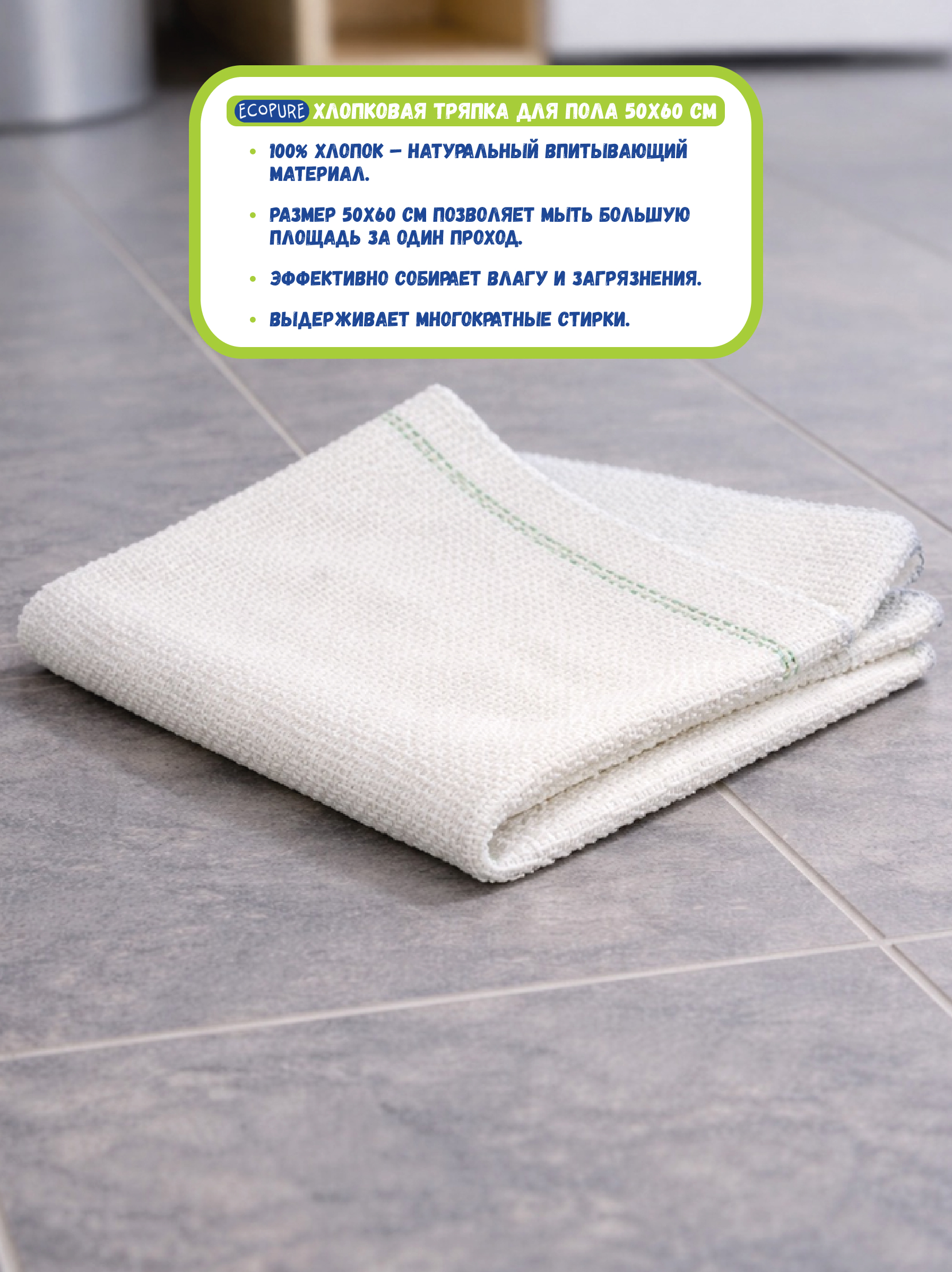 Тряпка для пола Ecopure предназначена для влажной уборки различных типов напольных покрытий. Подходит для плитки, ламината, линолеума, деревянных и других твердых поверхностей. Материал эффективно впитывает влагу и удерживает загрязнения, обеспечивая чистый результат без разводов.