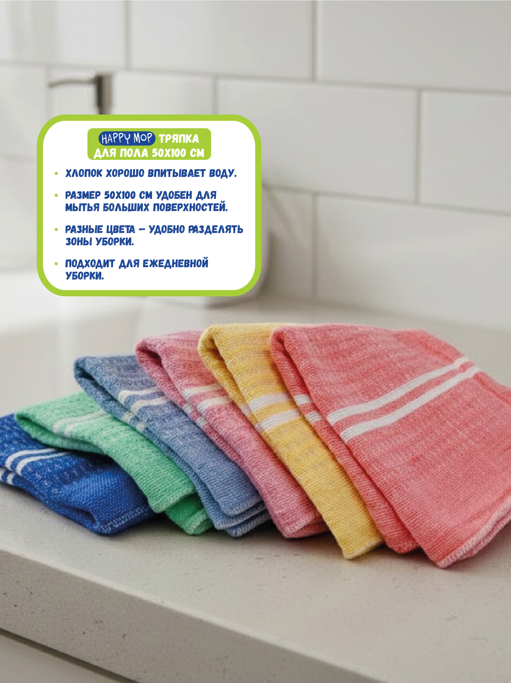 Тряпка для пола Happy Mop предназначена для влажной уборки различных типов напольных покрытий. Подходит для плитки, ламината, линолеума, деревянных и других твердых поверхностей. Тканая структура из натуральных волокон обеспечивает хорошую впитываемость и устойчивость к регулярной эксплуатации.