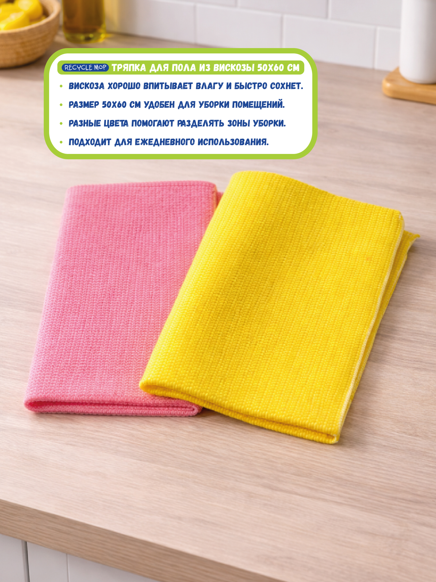 Тряпка для пола Recycle Mop предназначена для влажной уборки различных типов напольных покрытий. Подходит для плитки, линолеума, виниловых и других твердых поверхностей. Материал на основе переработанной вискозы отличается высокой впитываемостью и быстро собирает воду и загрязнения.
