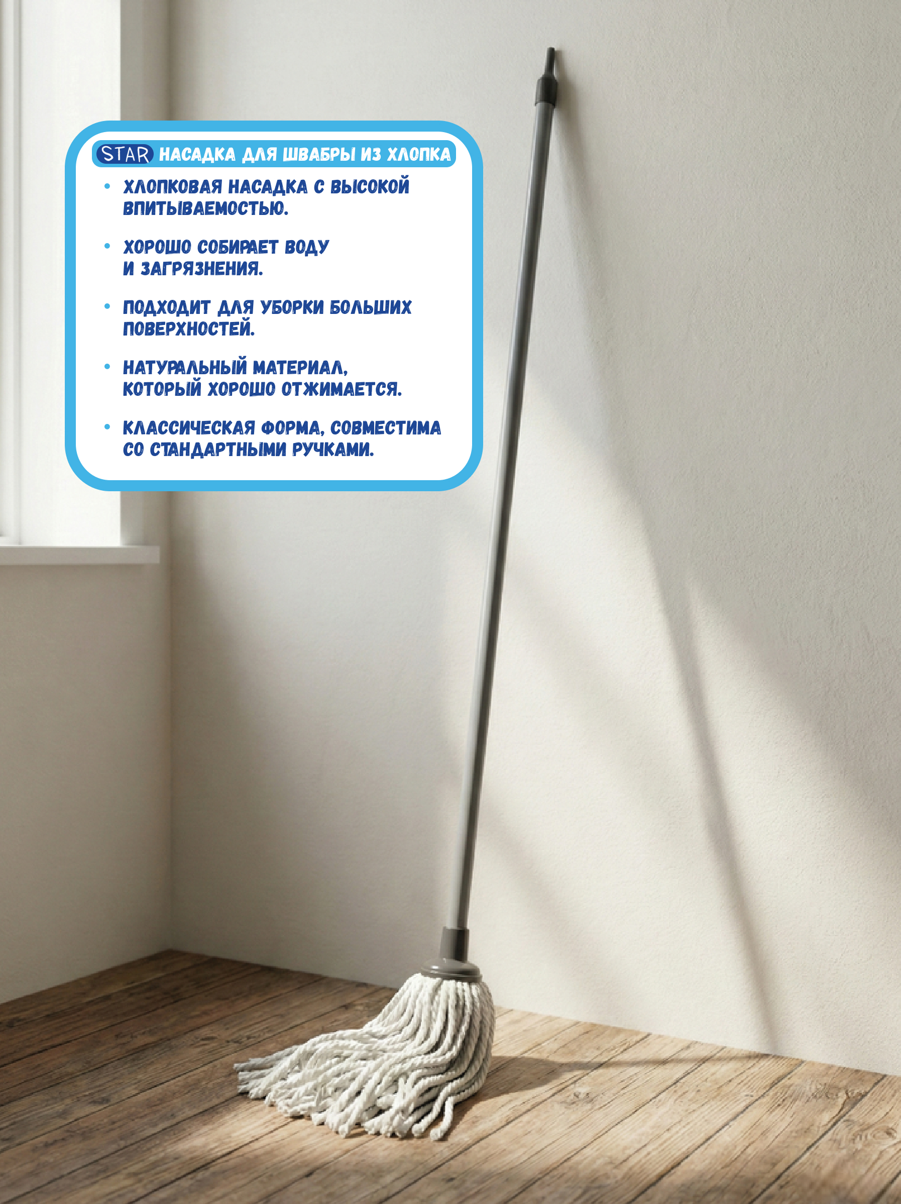 Насадка для швабры Star Classic предназначена для тщательной уборки гладких напольных покрытий и подходит для регулярного использования. Она хорошо удерживает воду и моющее средство, помогает эффективно собирать грязь и влагу и оставляет поверхность чистой, без разводов.