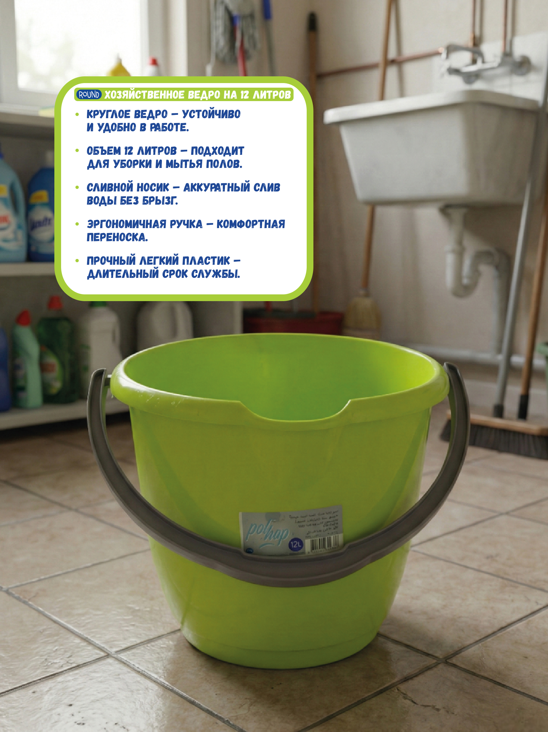 Круглое хозяйственное ведро Round объемом 12 литров предназначено для мытья полов и повседневной уборки. Легкое, прочное и простое в использовании, оно удобно при уборке и подходит для выполнения различных хозяйственных задач. Классическая круглая форма обеспечивает устойчивость и комфорт во время работы.