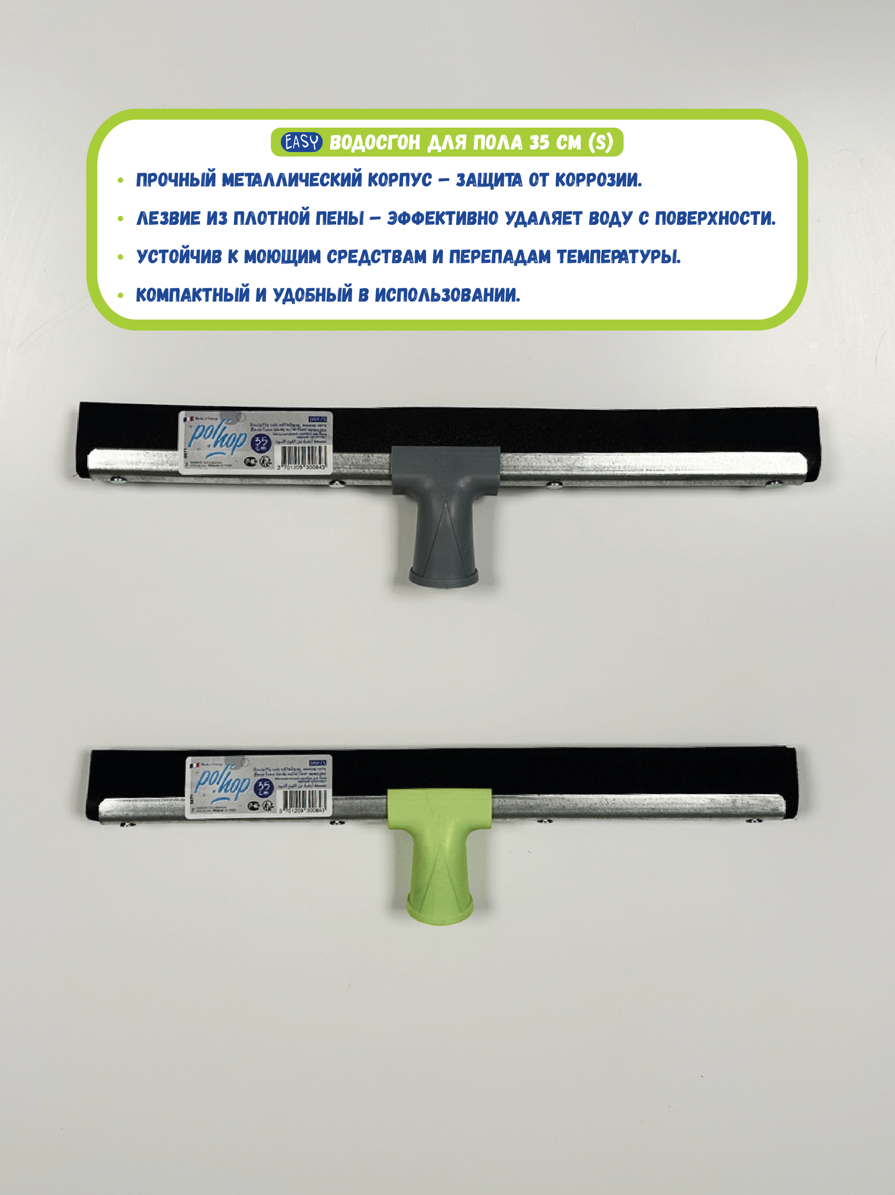 Сгон для пола Easy S 35 см предназначен для точной и эффективной уборки в ограниченных пространствах. Подходит для использования на кухнях, в ванных комнатах, мастерских и других зонах, где требуется удаление воды и других жидкостей. Рабочая ширина 35 см удобна для уборки в углах и узких участках.